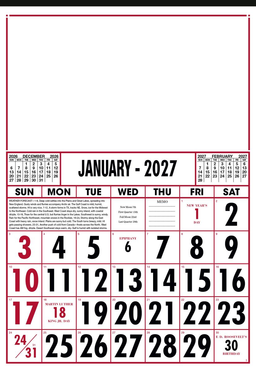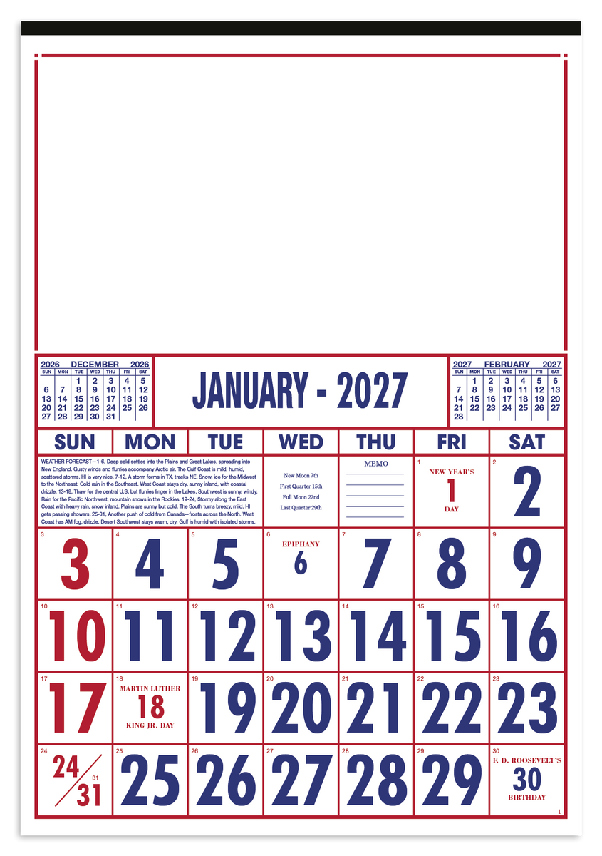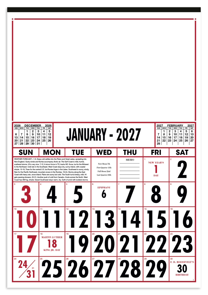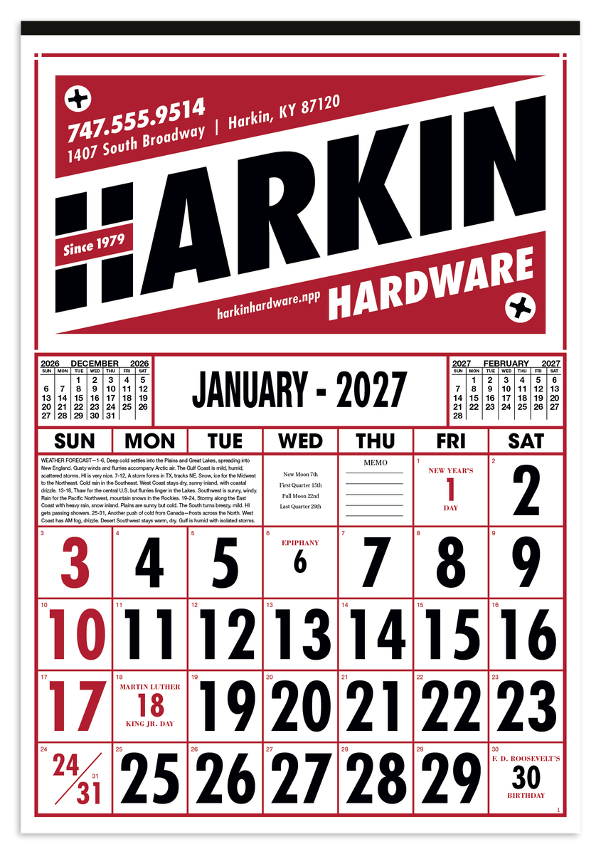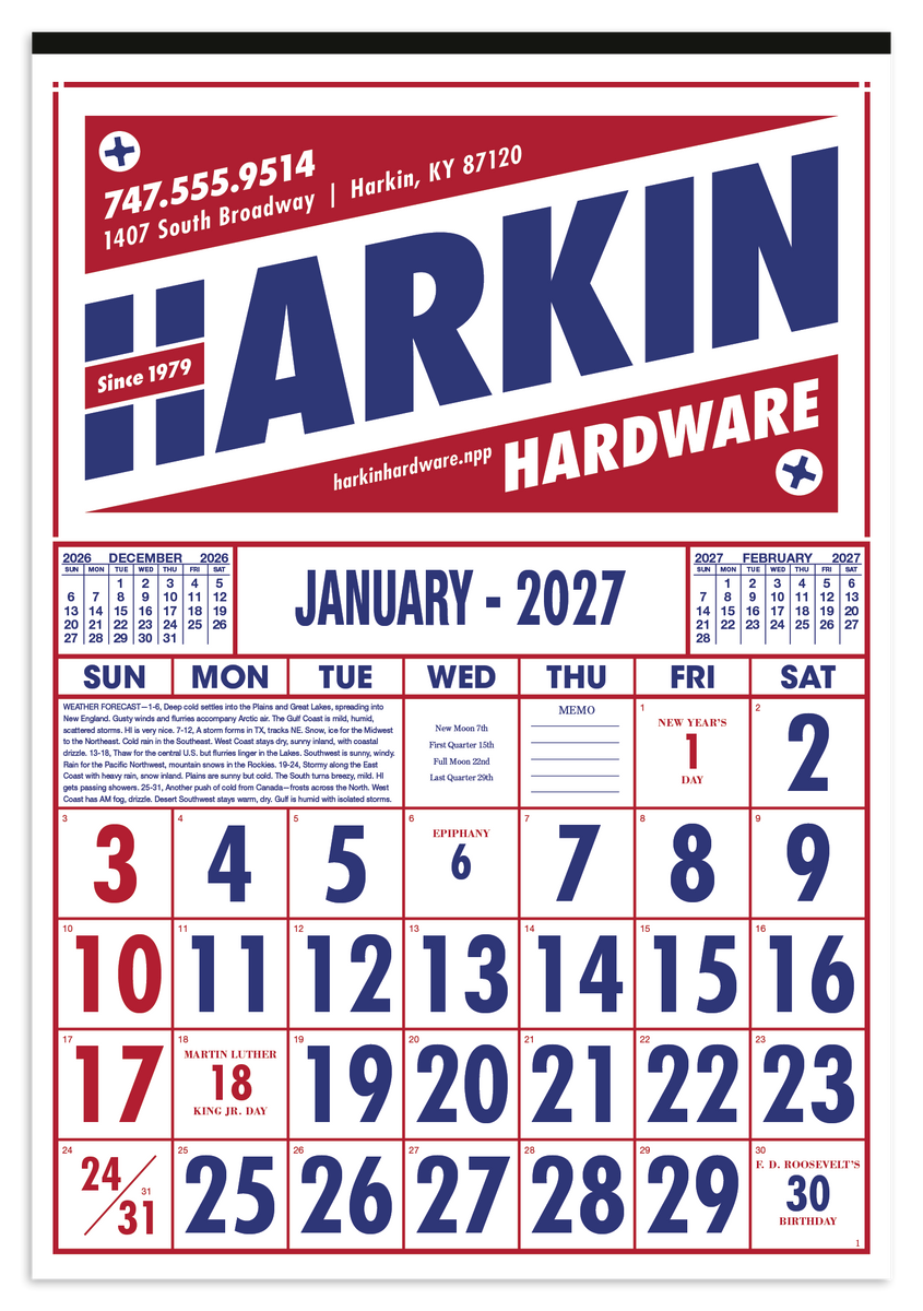 Designed for practicality and style, this commercial calendar features large, high-visibility numbers for easy readability at a glance. Previous and upcoming months are displayed for quick reference and special graphics draw attention to important observances. The SFI® label means that materials used for this product have been responsibly sourced.