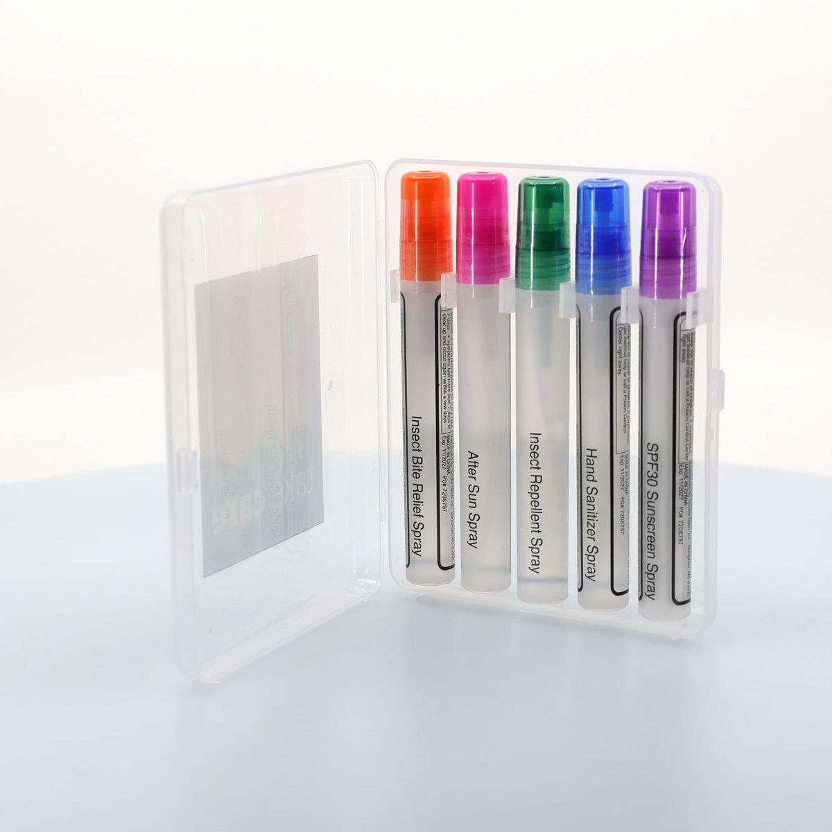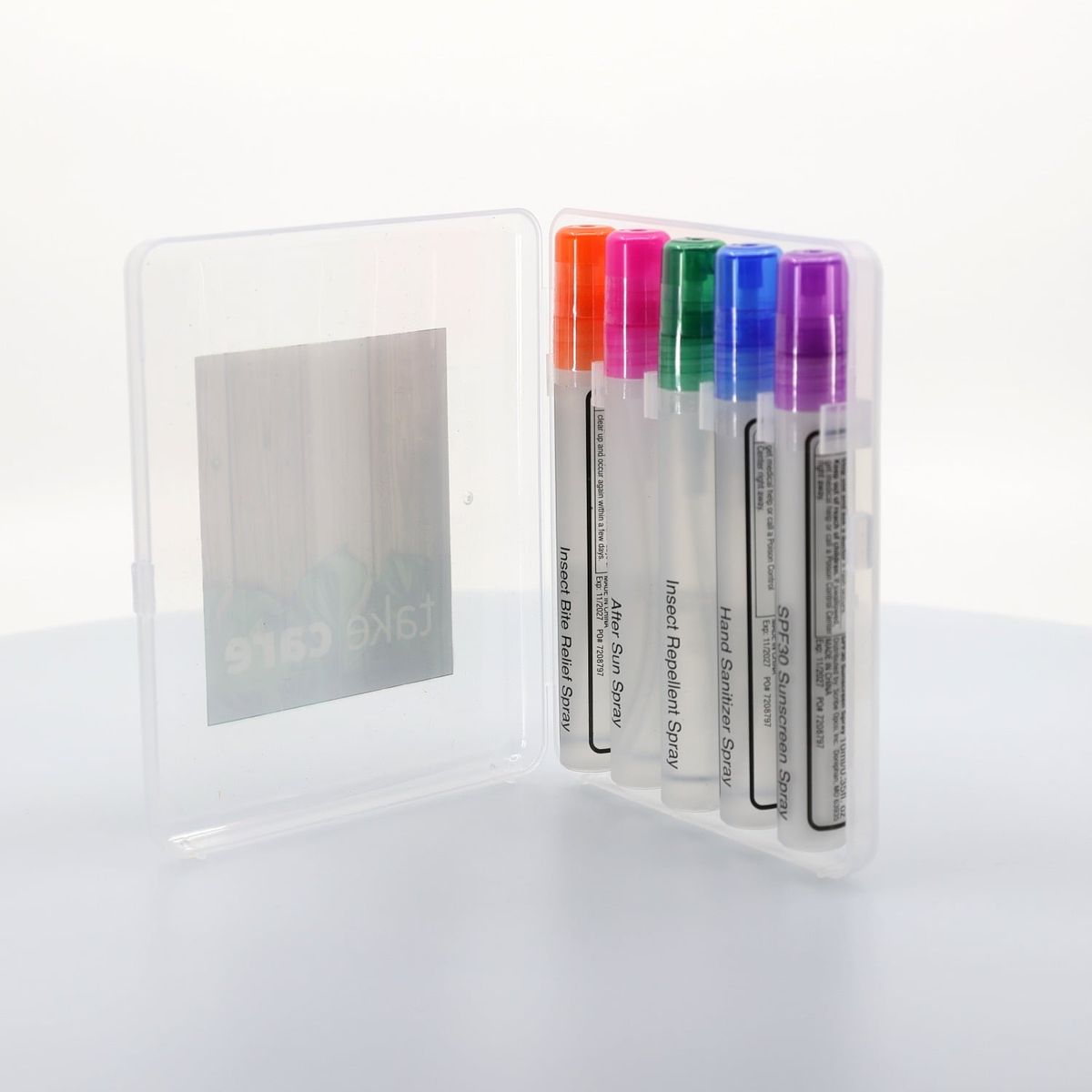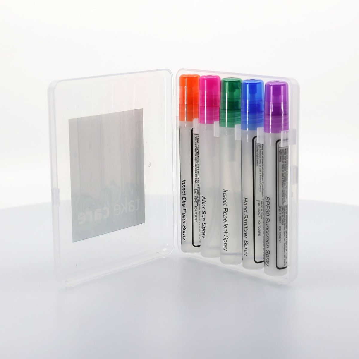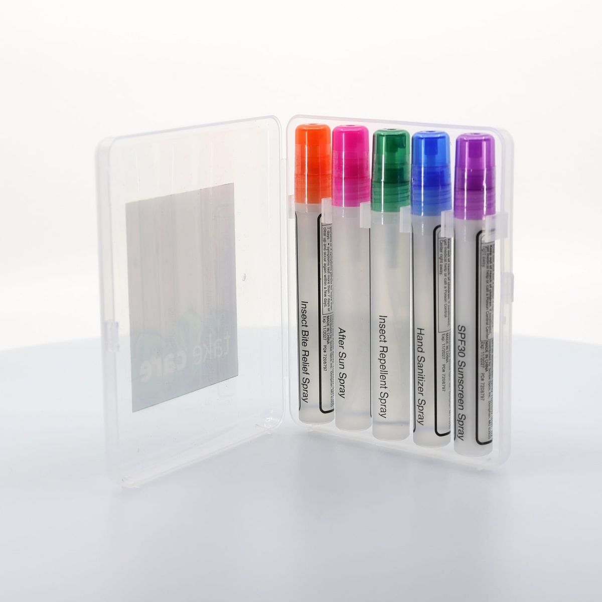 - Clear travel case includes .33oz. pen sprays of after sun, insect bite relief, insect repellent, hand sanitizer and SPF30 sunscreen.
