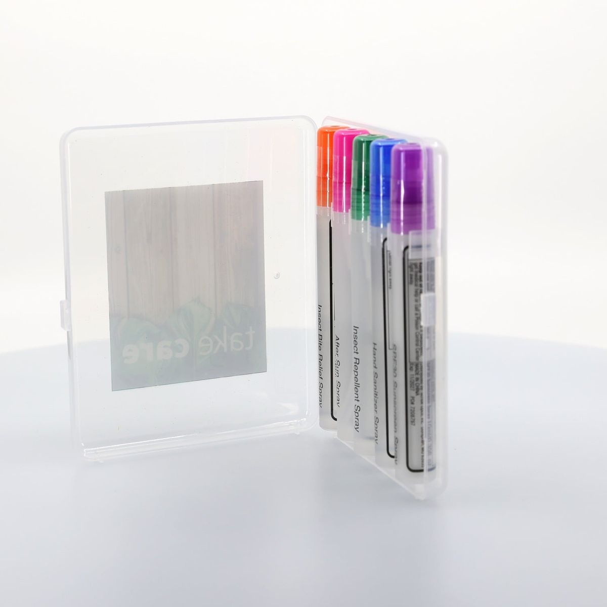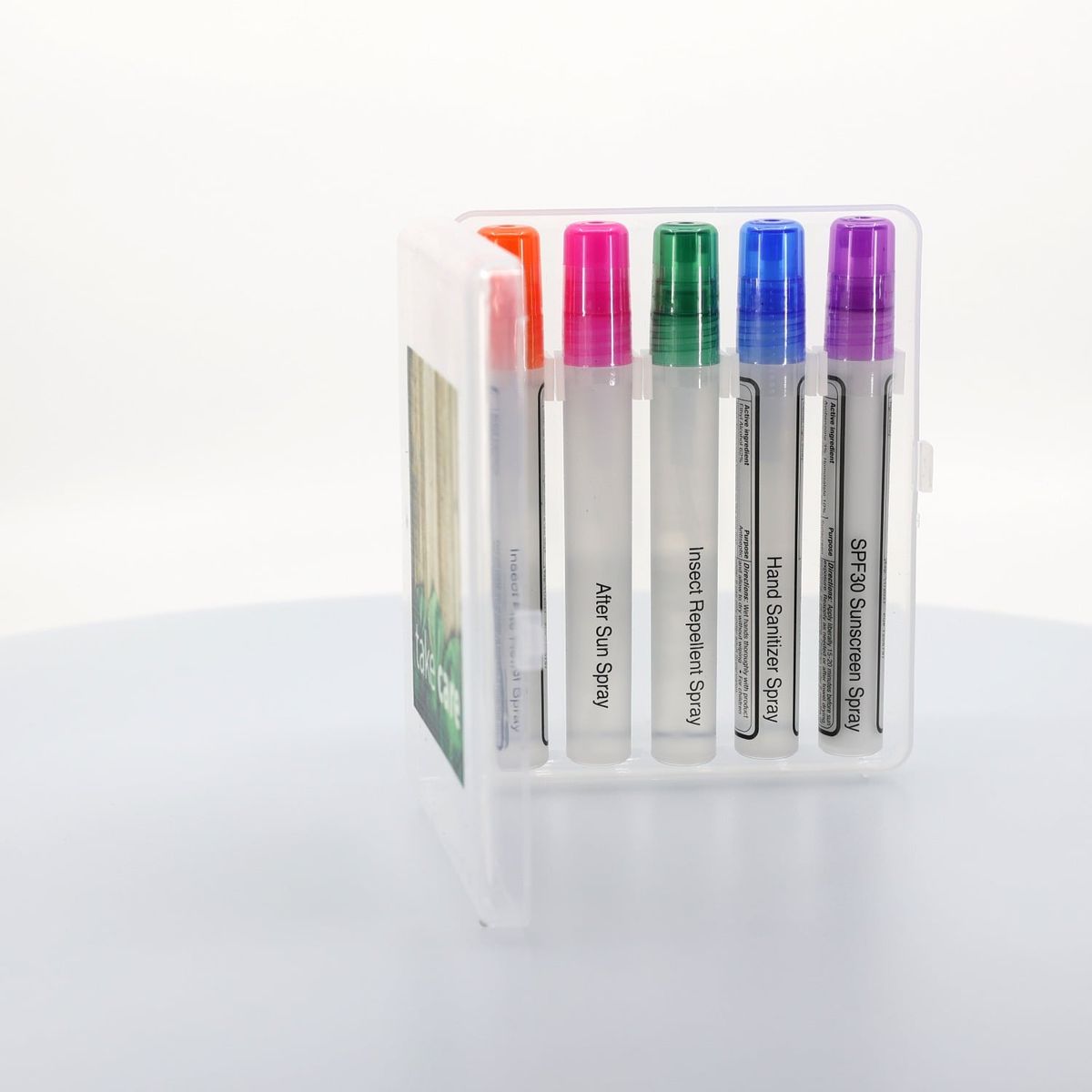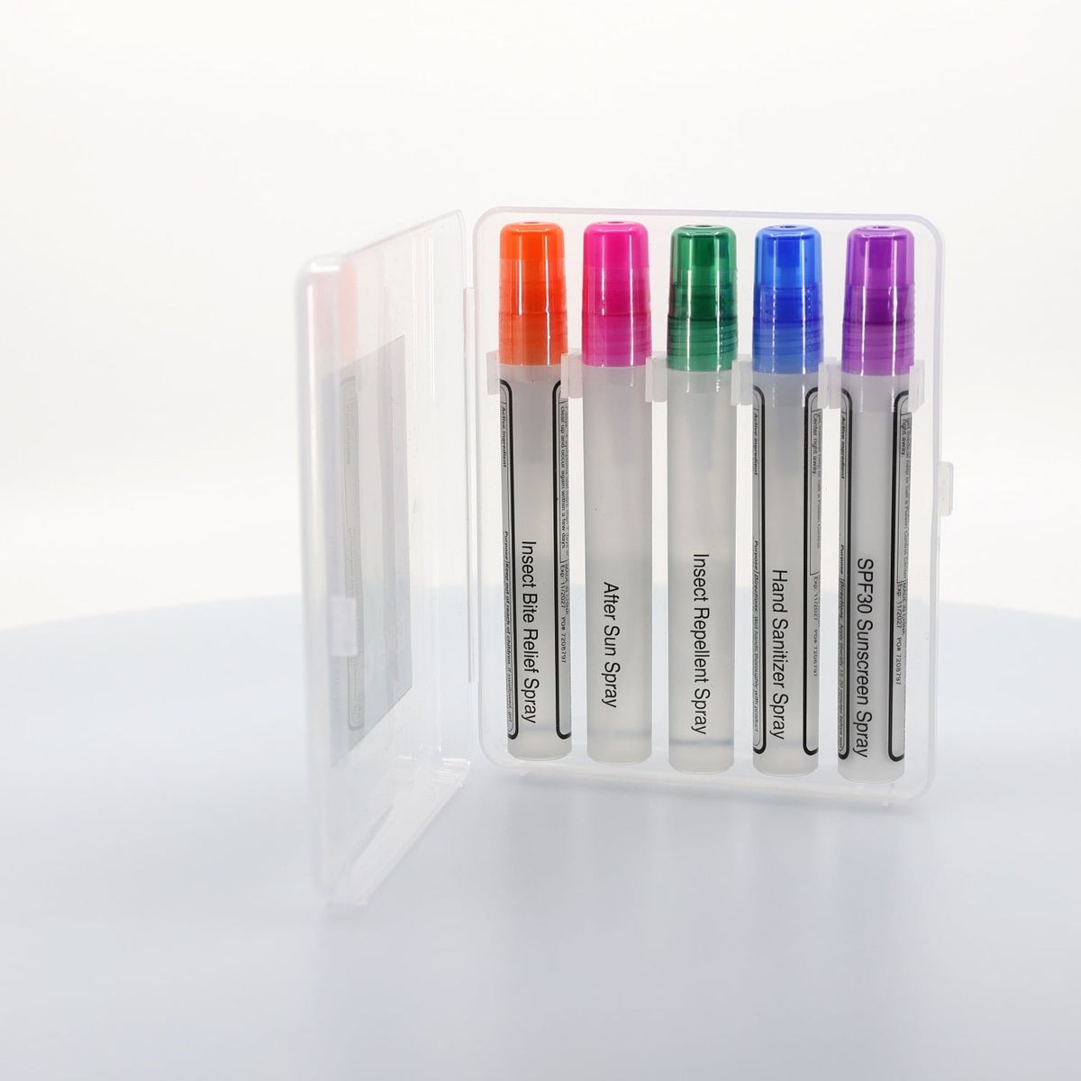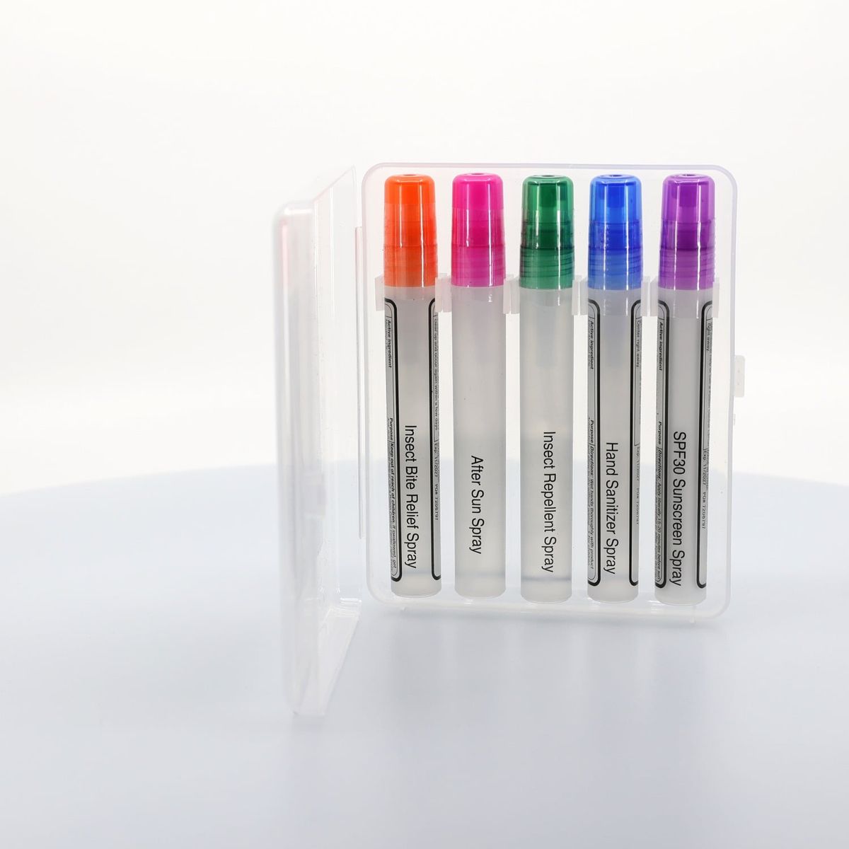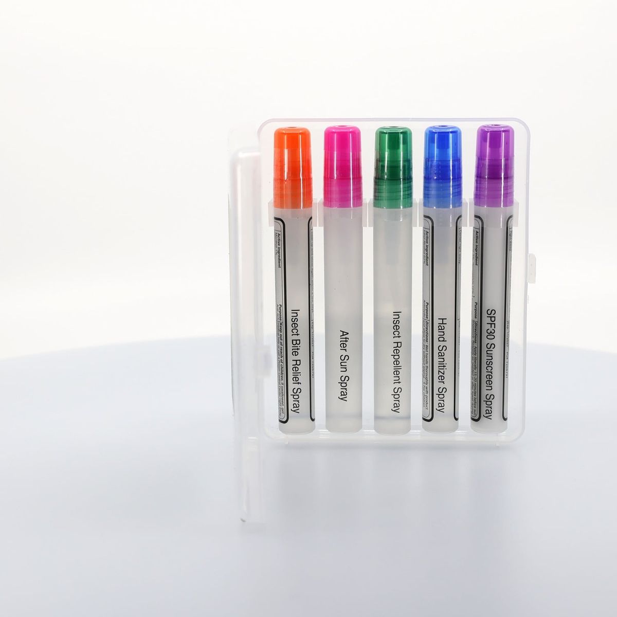 - Clear travel case includes .33oz. pen sprays of after sun, insect bite relief, insect repellent, hand sanitizer and SPF30 sunscreen.