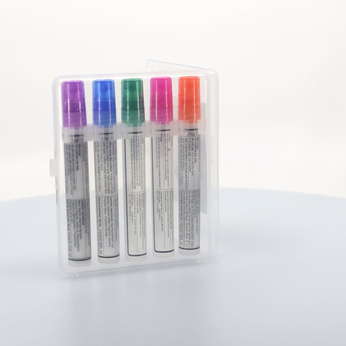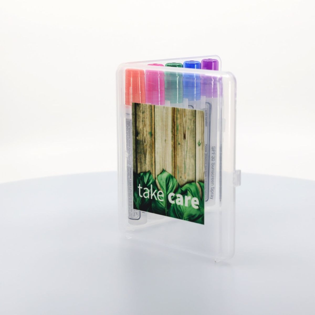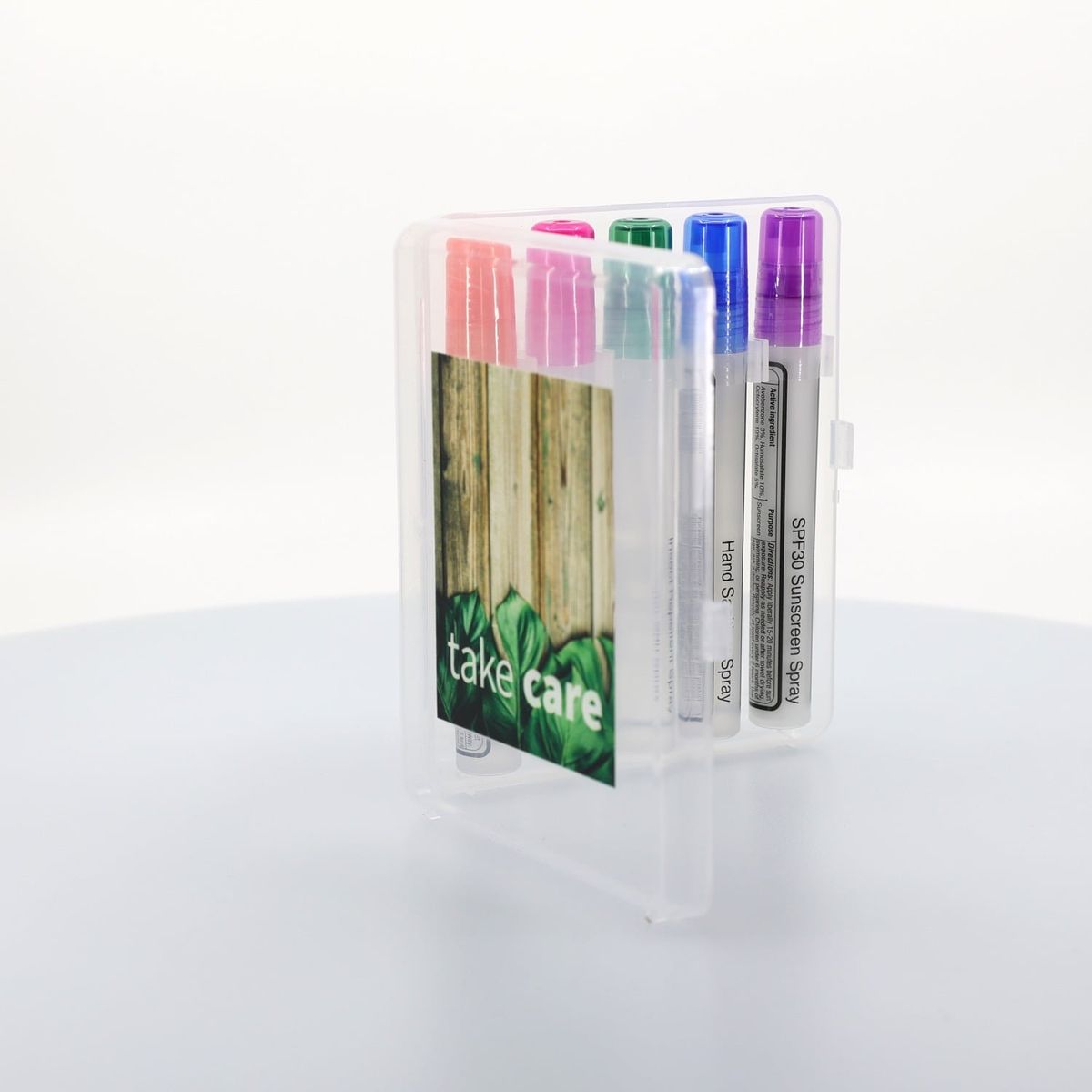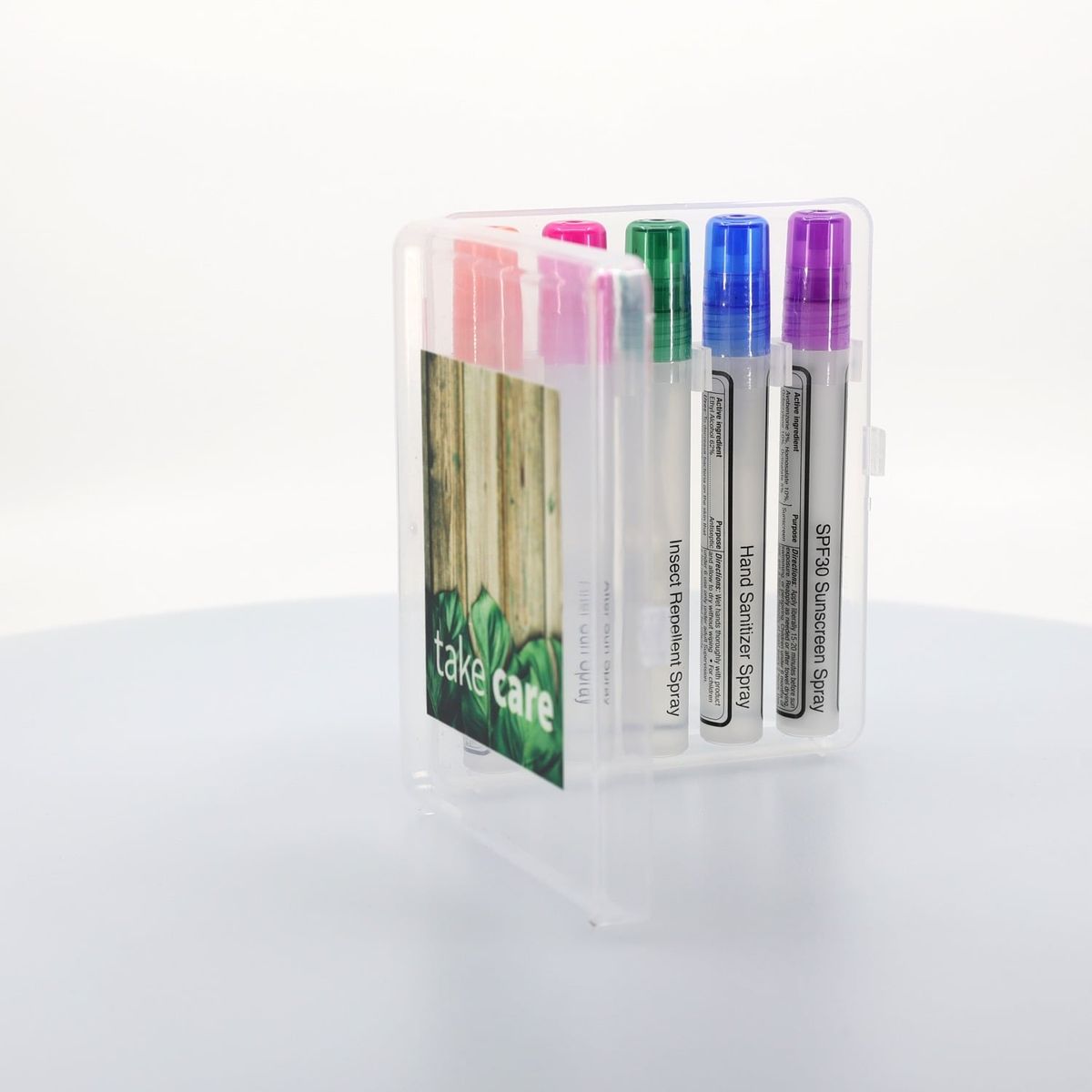 - Clear travel case includes .33oz. pen sprays of after sun, insect bite relief, insect repellent, hand sanitizer and SPF30 sunscreen.