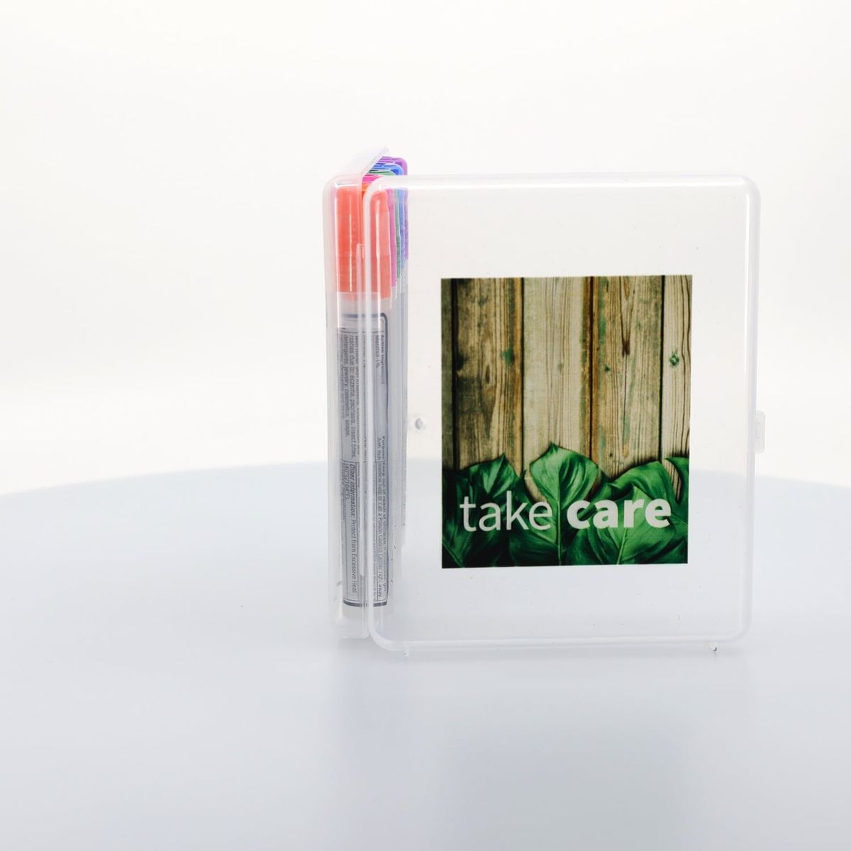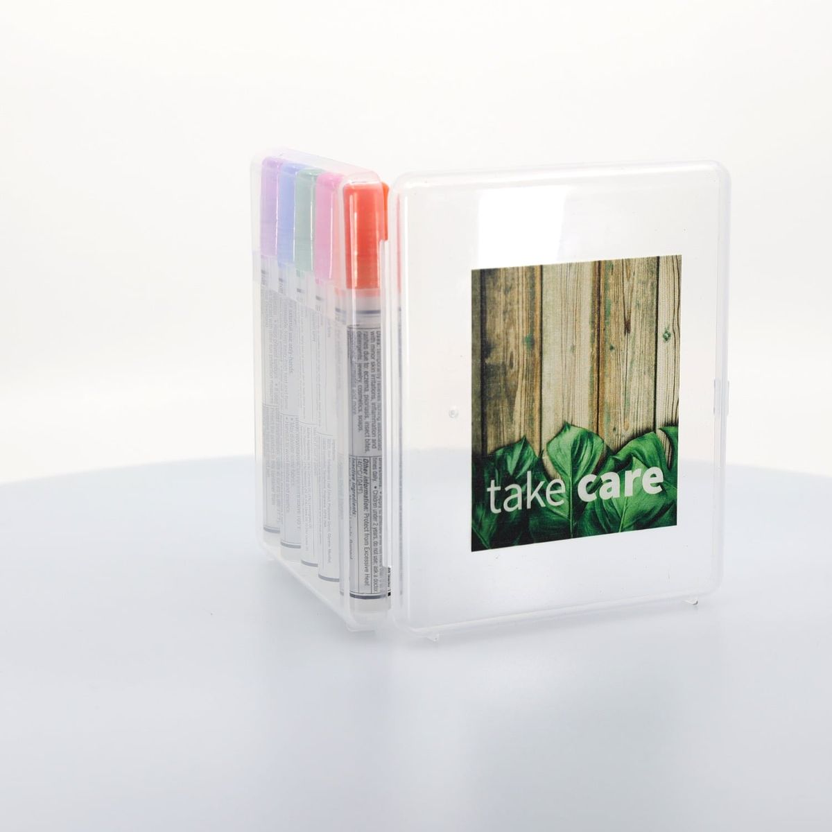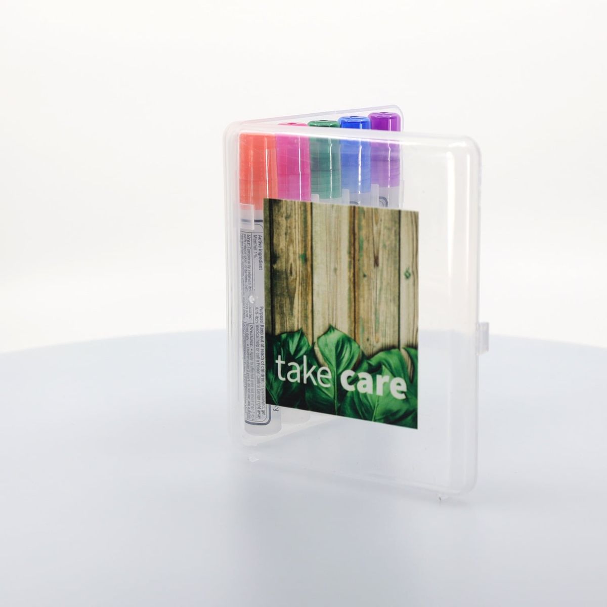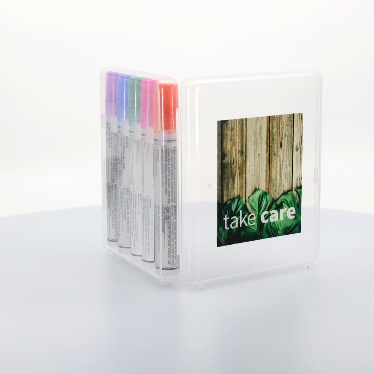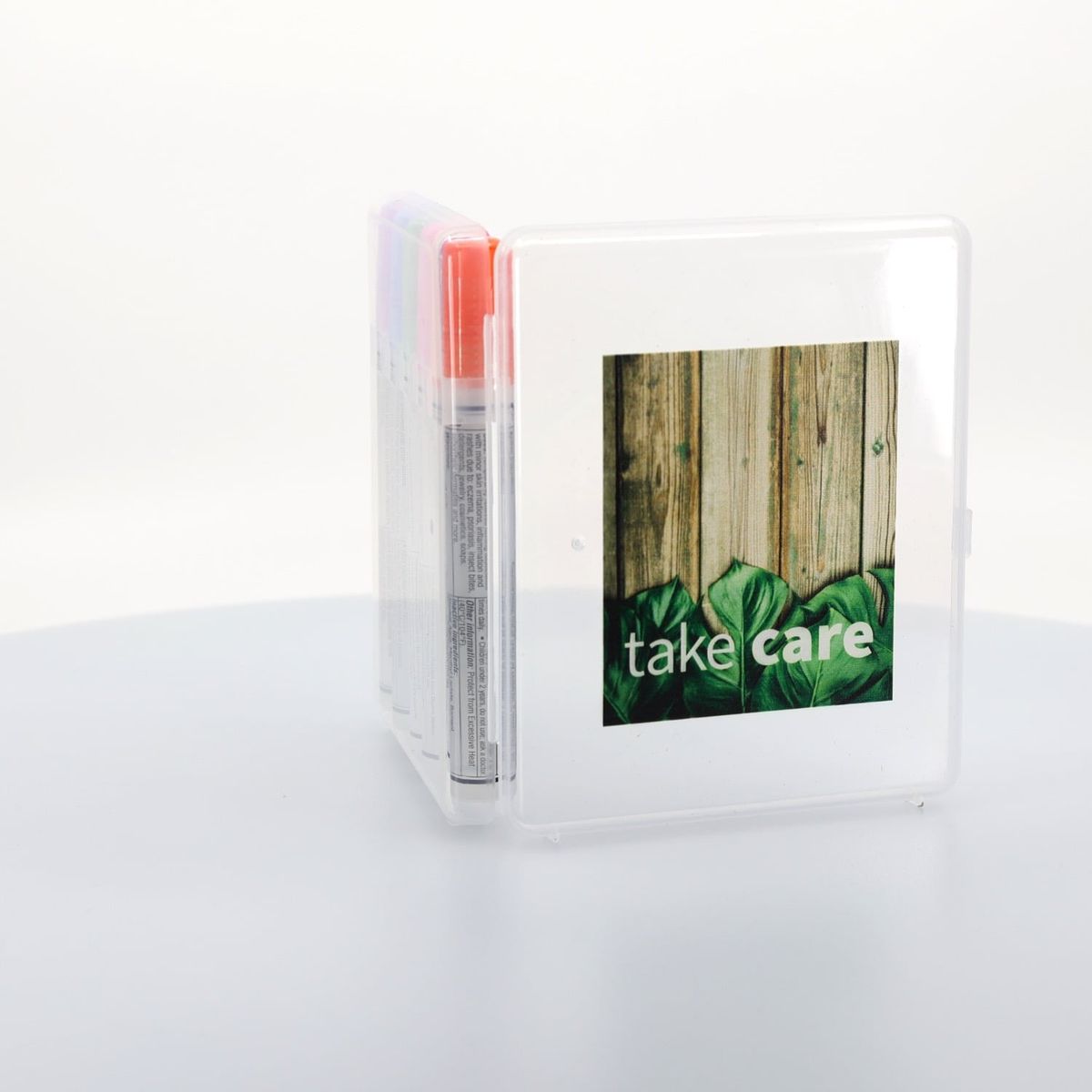 - Clear travel case includes .33oz. pen sprays of after sun, insect bite relief, insect repellent, hand sanitizer and SPF30 sunscreen.