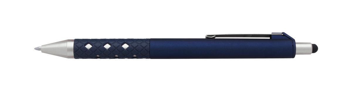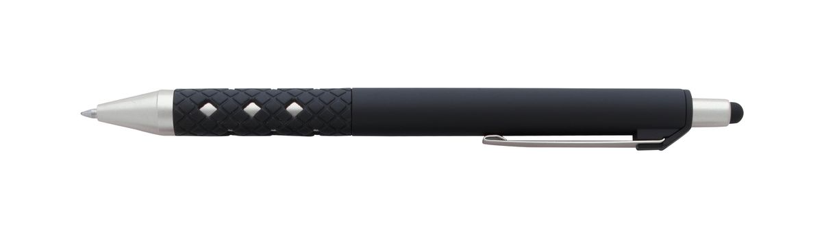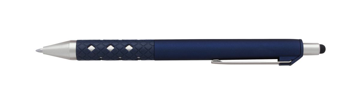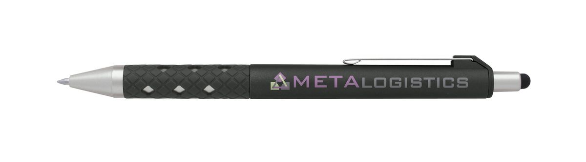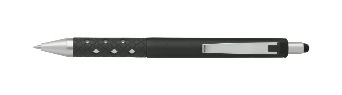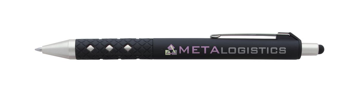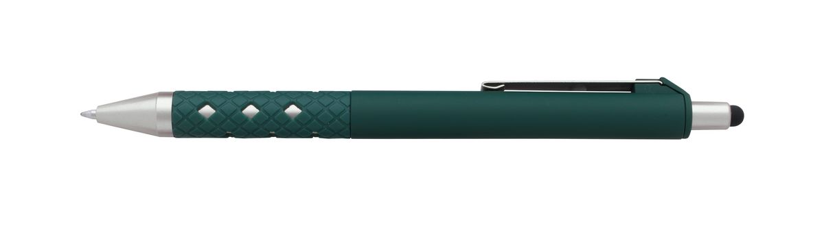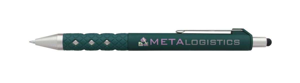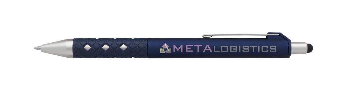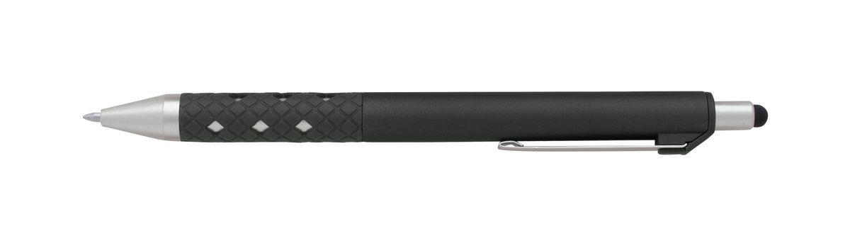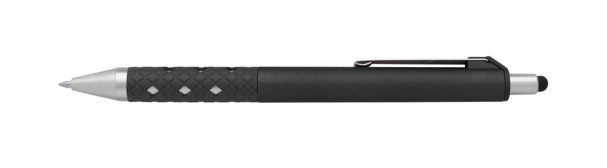 Make every word stand out with this bold retractable pen with stylus! The soft-touch barrel and edgy cross-hatch grip with peek-a-boo cutouts deliver comfort and control, while the 0.7mm fine-point tip lays down smooth, precise lines. Packed with fraud-resistant ink and finished with a sturdy metal clip, this pen combines modern styling with a premium writing experience that will impress. 43% of overall product is made of post-consumer recycled ABS.