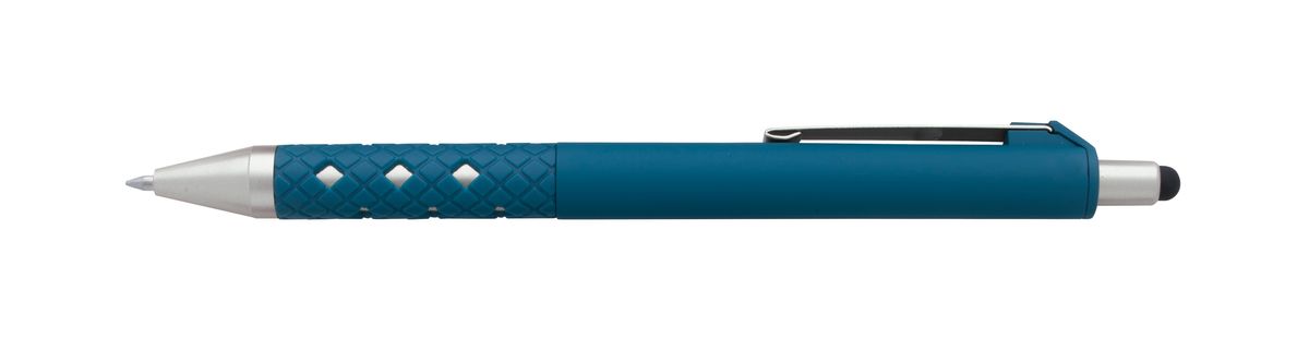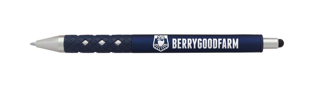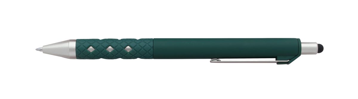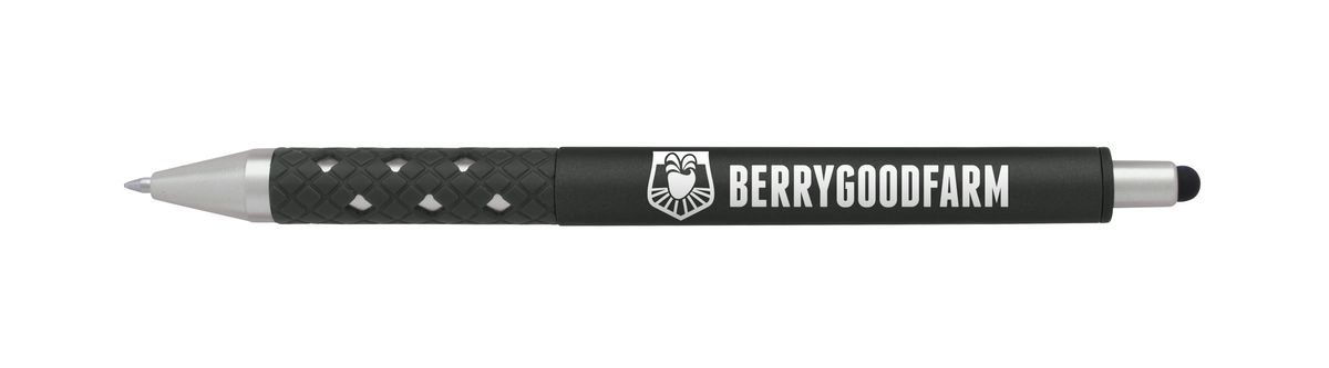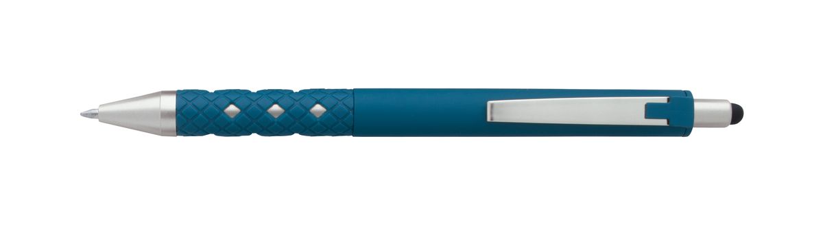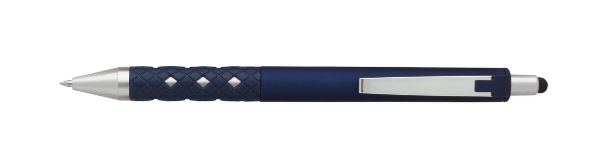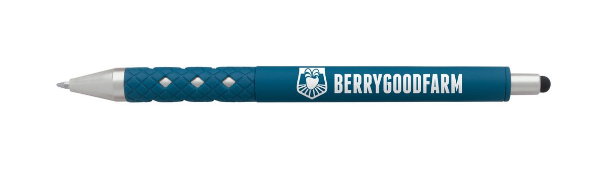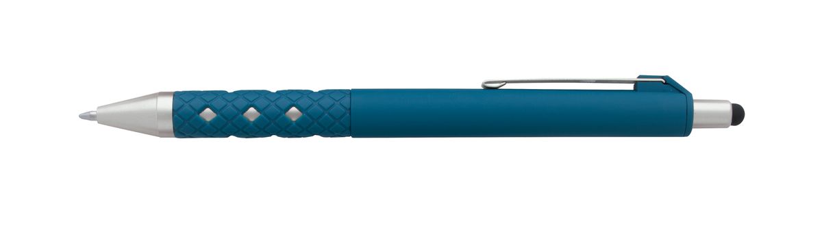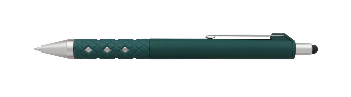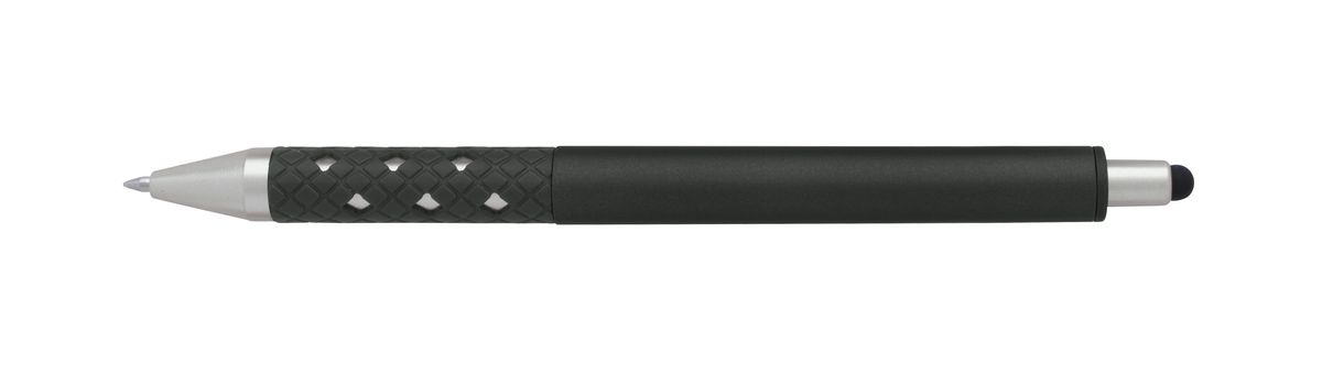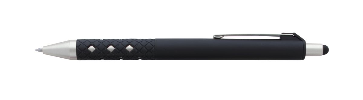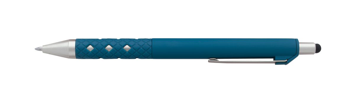 Make every word stand out with this bold retractable pen with stylus! The soft-touch barrel and edgy cross-hatch grip with peek-a-boo cutouts deliver comfort and control, while the 0.7mm fine-point tip lays down smooth, precise lines. Packed with fraud-resistant ink and finished with a sturdy metal clip, this pen combines modern styling with a premium writing experience that will impress. 43% of overall product is made of post-consumer recycled ABS.
