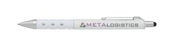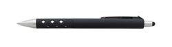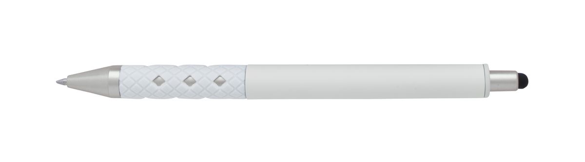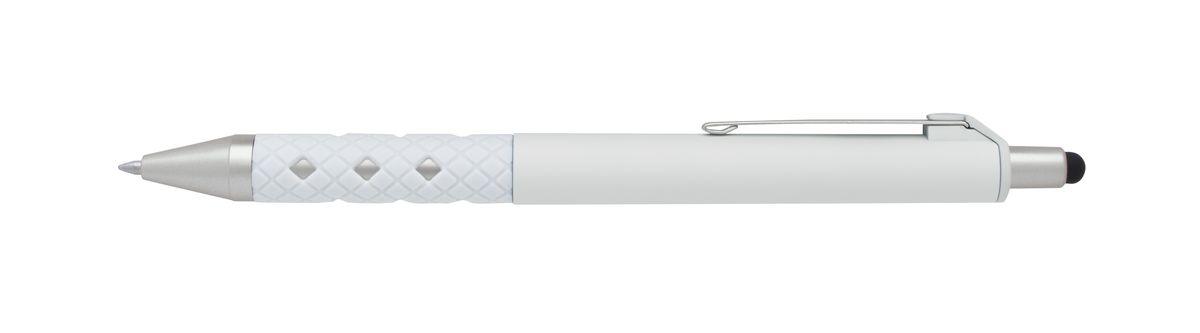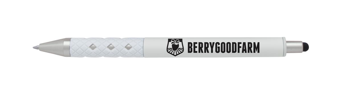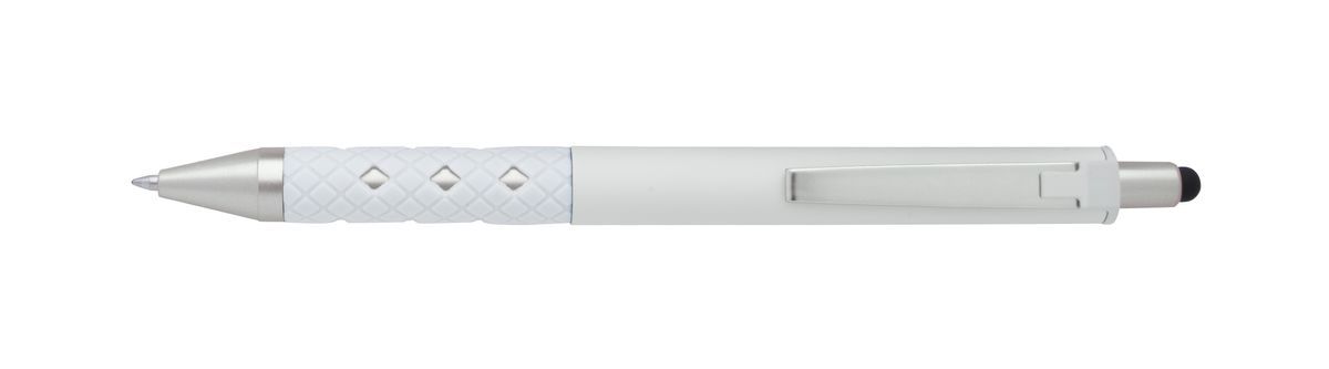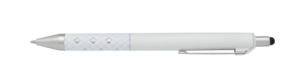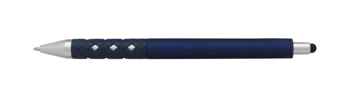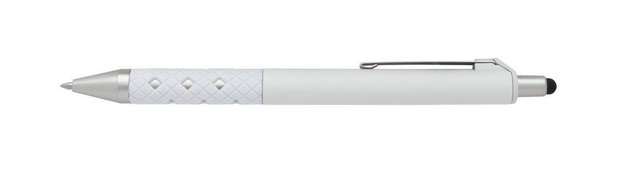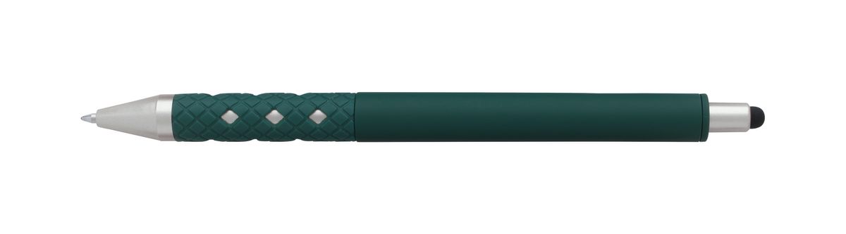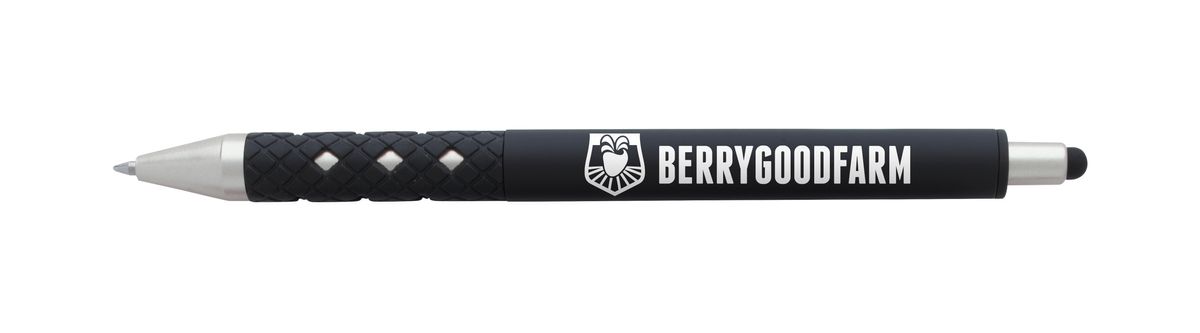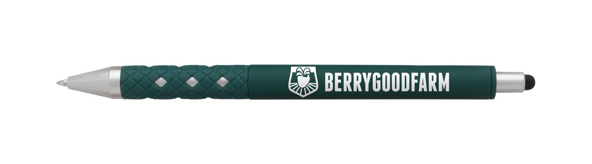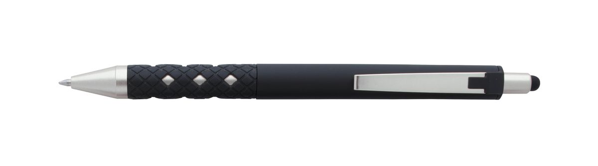 Make every word stand out with this bold retractable pen with stylus! The soft-touch barrel and edgy cross-hatch grip with peek-a-boo cutouts deliver comfort and control, while the 0.7mm fine-point tip lays down smooth, precise lines. Packed with fraud-resistant ink and finished with a sturdy metal clip, this pen combines modern styling with a premium writing experience that will impress. 43% of overall product is made of post-consumer recycled ABS.