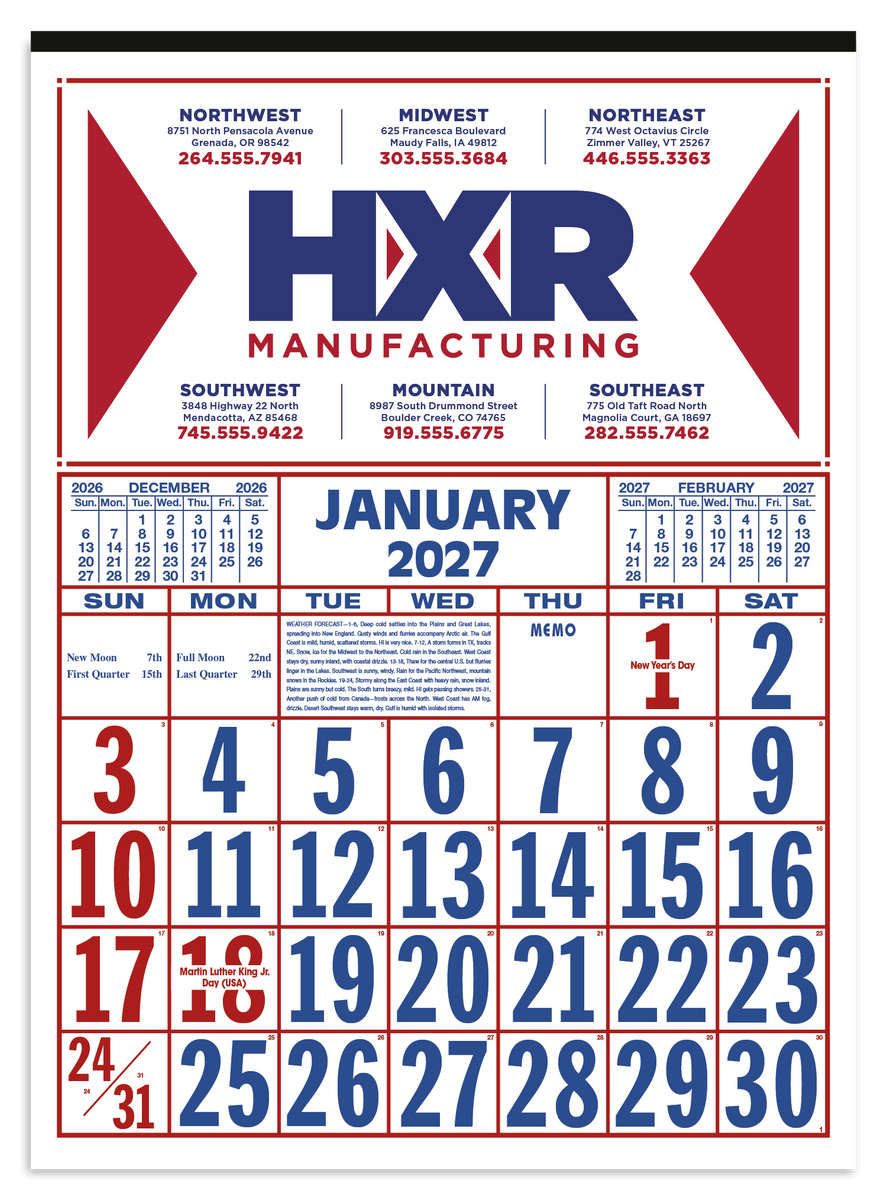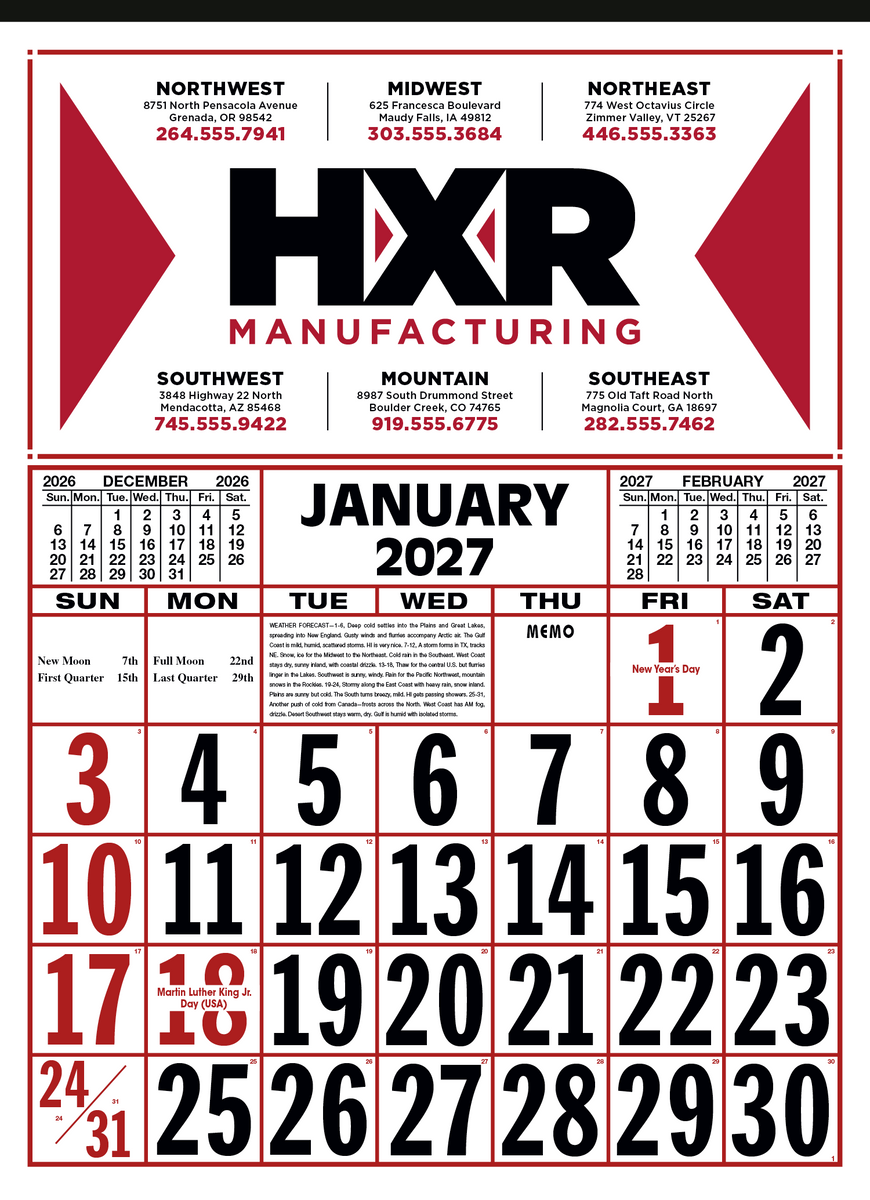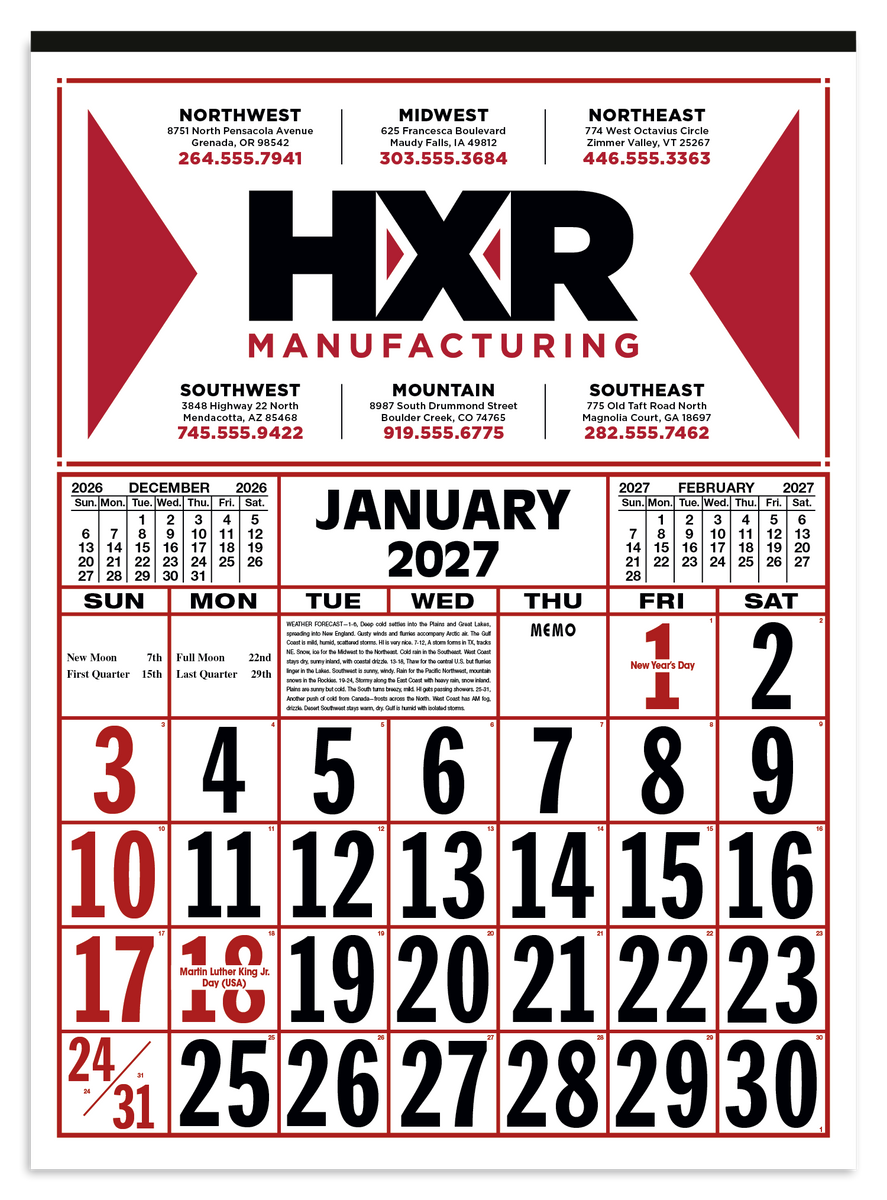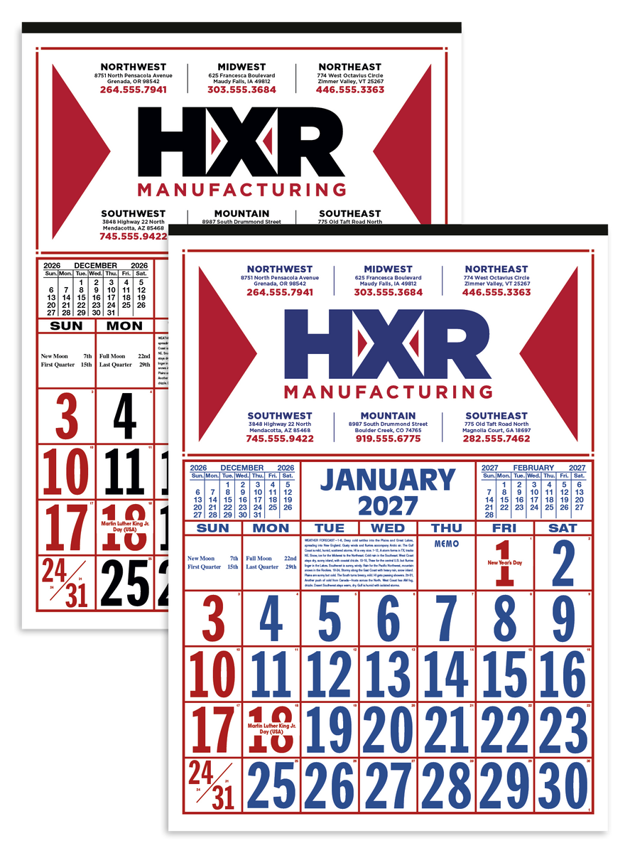 Keep track of the date at a glance with this large-format 12-sheet commercial calendar. The bold numbers and clear layout make it easy to stay organized, while the previous and upcoming months provide convenient reference. The SFI® label means that materials used for this product have been responsibly sourced.