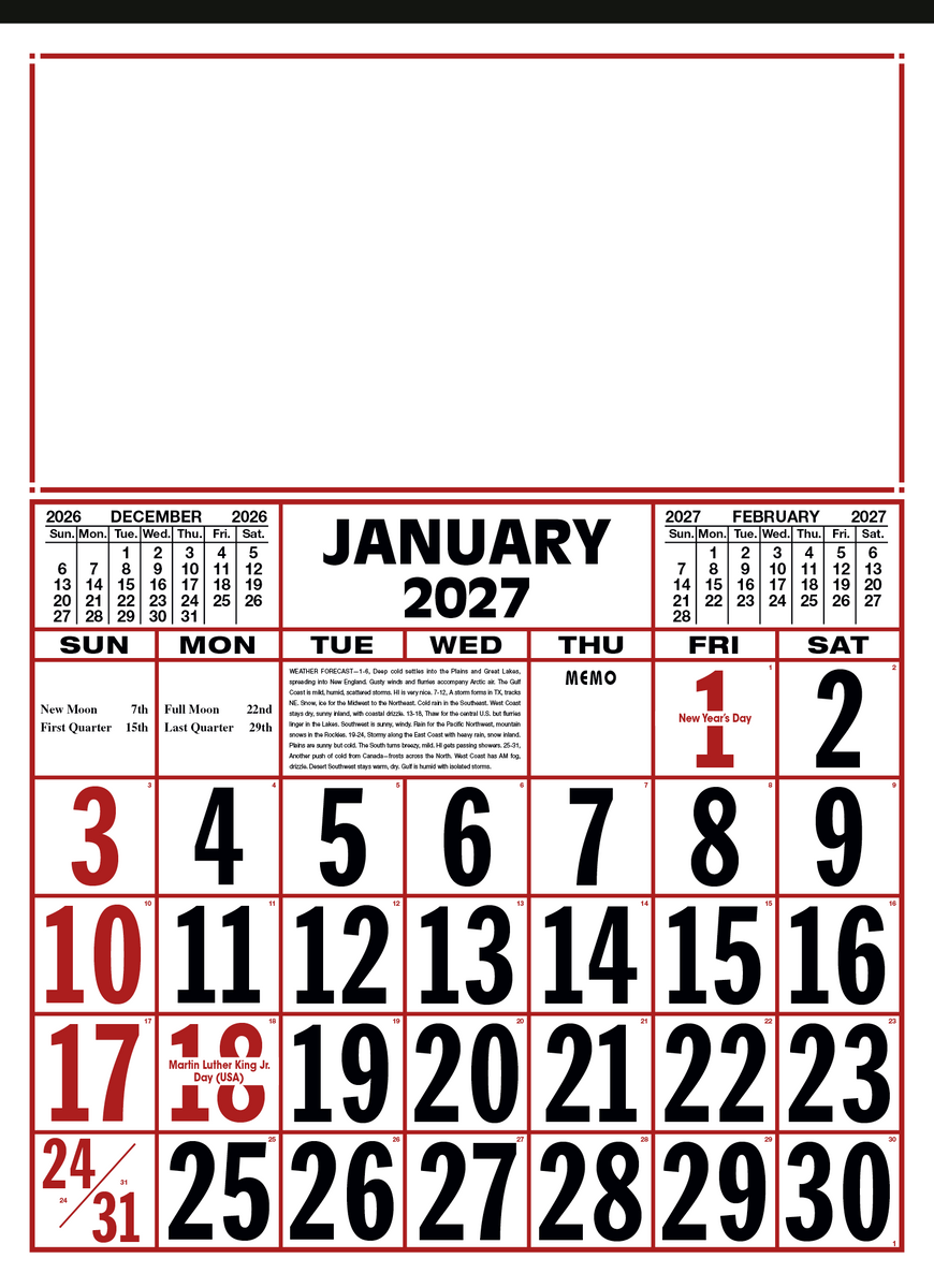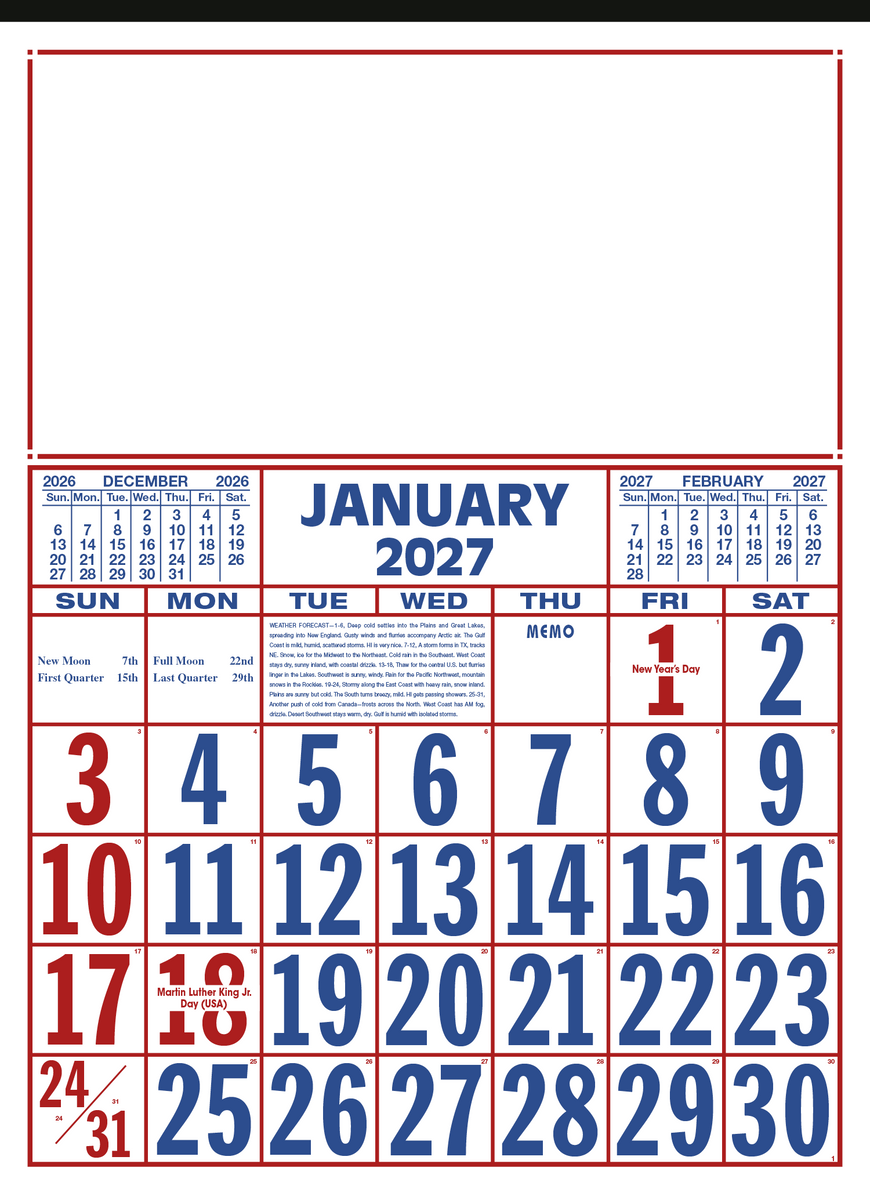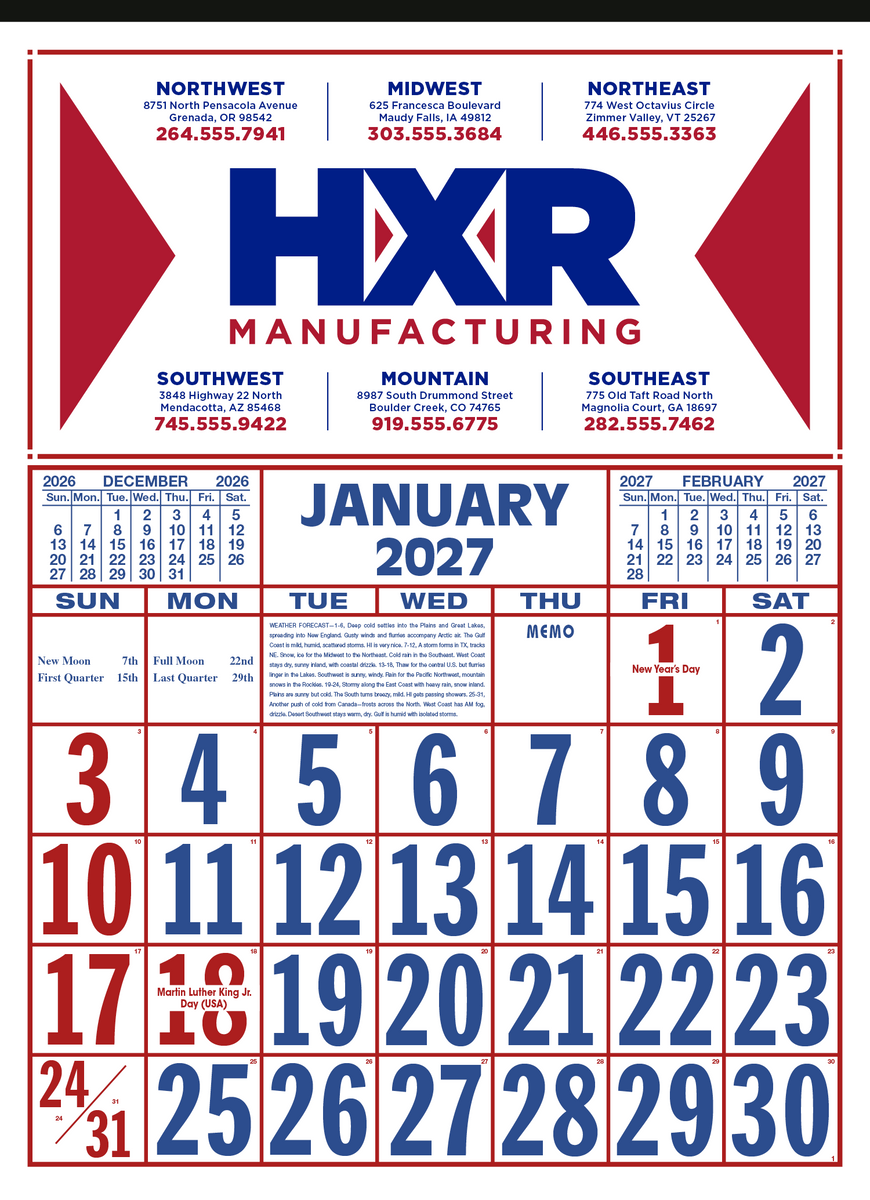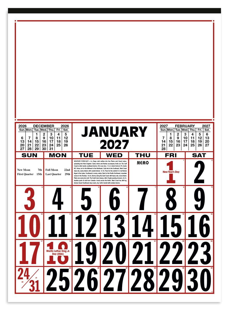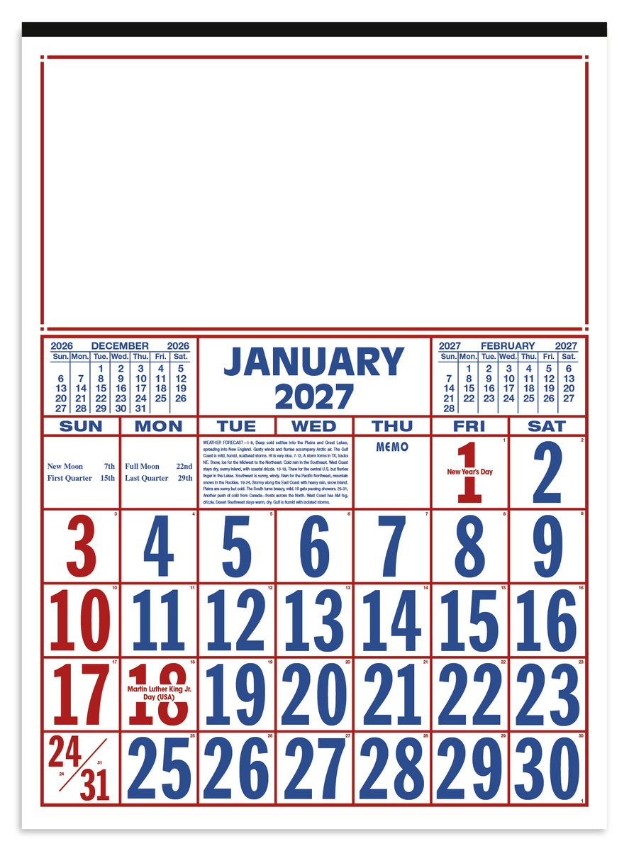 Keep track of the date at a glance with this large-format 12-sheet commercial calendar. The bold numbers and clear layout make it easy to stay organized, while the previous and upcoming months provide convenient reference. The SFI® label means that materials used for this product have been responsibly sourced.
