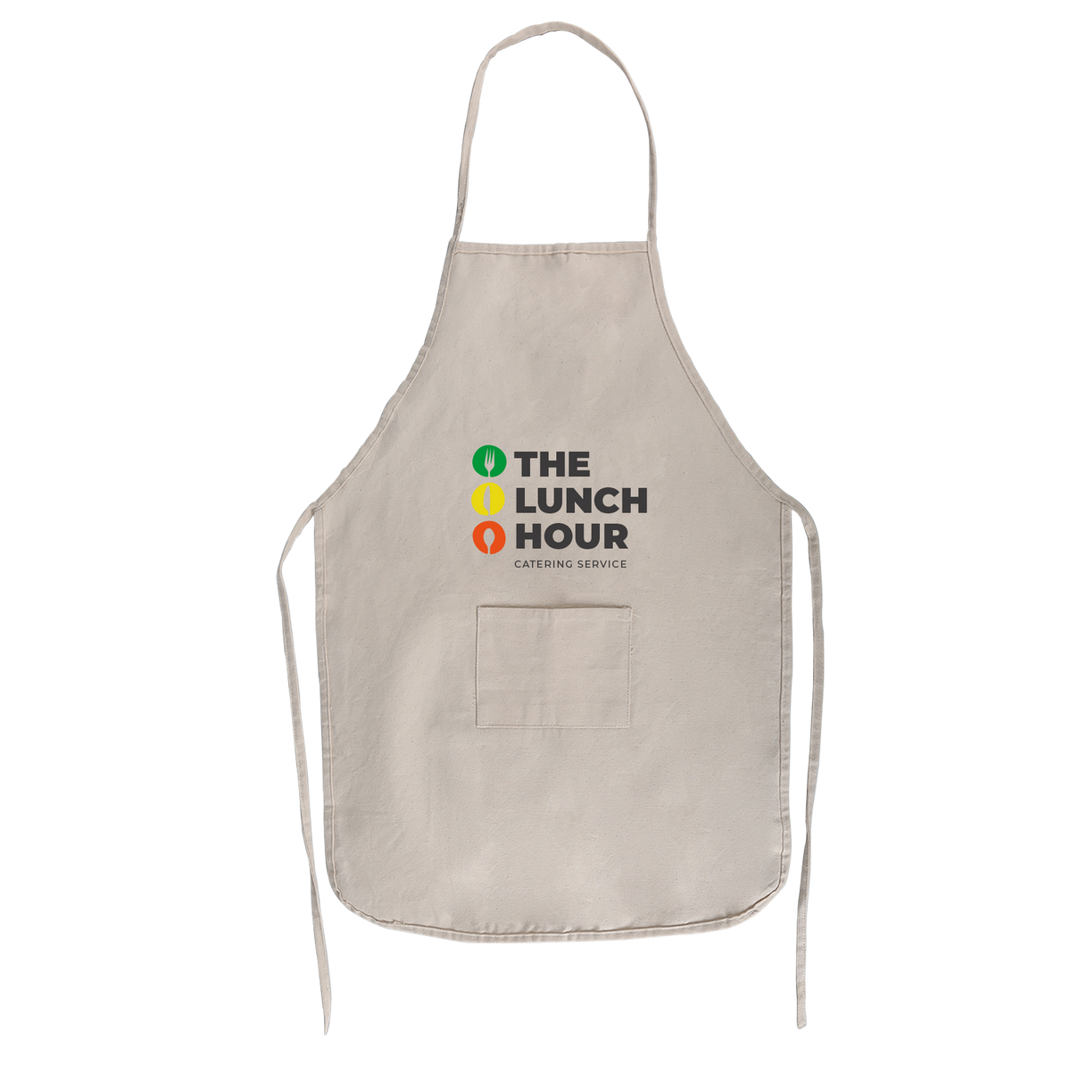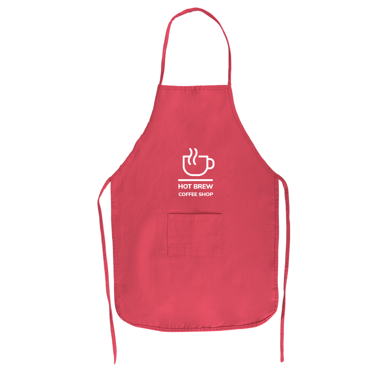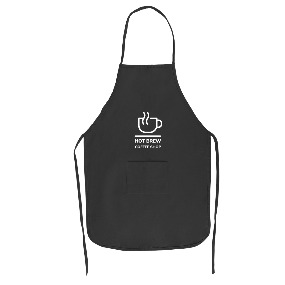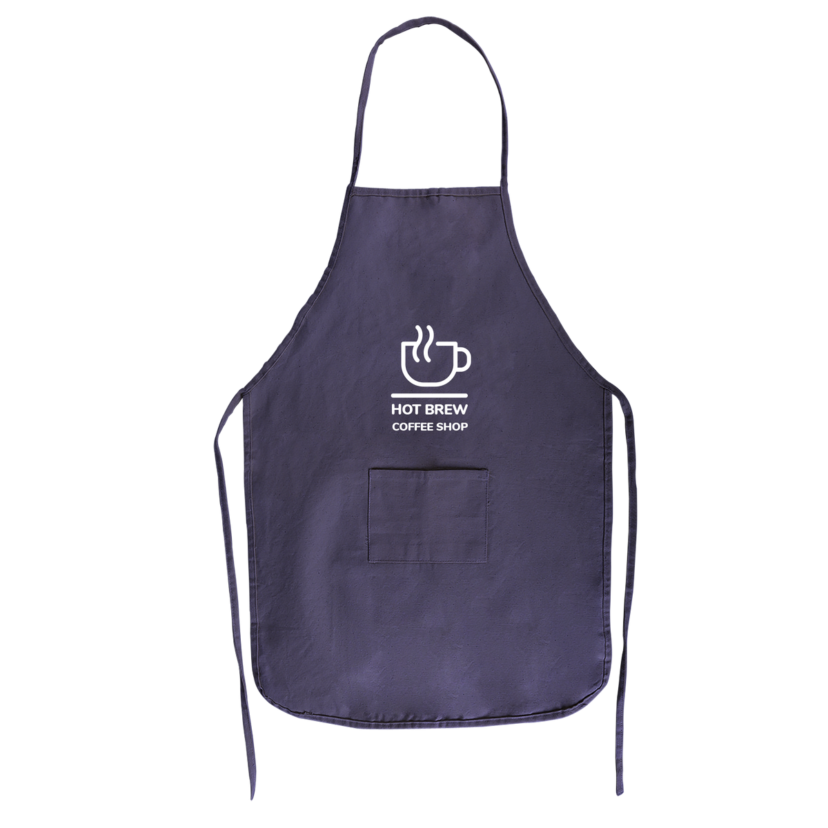 This grilling and cooking apron is made from 100% cotton fabric and features a neck strap, adjustable tie waist straps and a 5" H x 6 1/2" W front pocket for convenient storing of necessities. 10 oz.